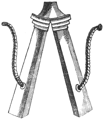 To render the deception as complete as possible, proceed as follows:—Make a bodkin, or nail, the blade thereof being cut in the middle, so that one part may not be close to the other, by almost three quarters of an80 inch, each part being kept asunder by a small crooked piece of iron, of the fashion described in the next trick; then thrust your tongue between the aforesaid place, to wit, into the space left in the bodkin-blade, thrusting the said part behind your teeth, and biting it. It will seem to stick so fast in, and through your tongue, that one can hardly pull it out. You must have another bodkin or nail, just like the false one, to show the company.