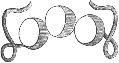 You must have two rings made of silver or brass, or what you please, of one size, colour, and likeness, saving that one must have a notch through it, and the other must be whole, without a notch; show the whole ring, but conceal that which hath the notch, and say, “Now I’ll put this ring through my cheek,” and privately slip the notch over one side of your mouth; then take a small stick, which you must have in readiness, and slip the whole ring upon it, holding your hand over it about the middle of the stick; then bid somebody hold fast the stick at both ends, and say, “See this ring in my cheek,—it turns round;” then, while you perceive them fasten their eyes upon that ring, on a sudden, whip it out, and smite upon the stick therewith; instantly concealing and whirling the other ring you hold your hand75 over, round about the stick. It will be thought that you have brought that ring upon the stick which was upon your cheek.