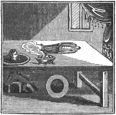 This is practised with a boy instructed for the purpose, who, being familiar with the company, may be known as well by his face as by his apparel. At the other end of the table, where the like hole is made, another boy, of the same size, must be placed, having on his usual apparel; he must lean or lie upon the board, and put his head underneath it, through the said hole; so that the body shall seem to lie on one end of the board, and his head shall lie in a platter on the other end. There are other rules to be observed; as, to put about his neck a little dough, kneaded with bullock’s blood, which, being cold, will look like dead flesh, and, being pricked with a sharp quill, filled with blood, will seem to bleed.—You must be particular to have the table-cloth so long and so wide as that it may almost reach the ground. Also, let this be your last trick, taking care not to suffer the company to stay too long in the place after it is performed.