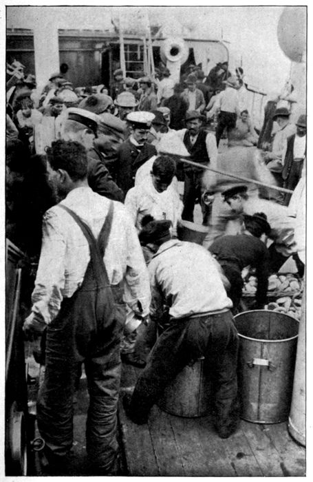 | Men’s Sleeping-quarters—Ladling out Food—The Purser Hurling Passengers About—On the Fo’c’s’l-head | Facing page | 194 |