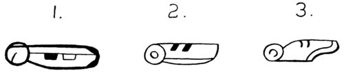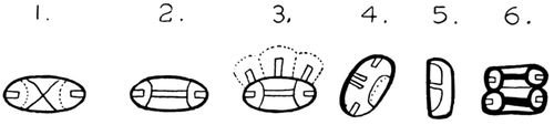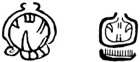 113. In Maya a comb is xel. This as a verb means “to cut in two;” and as a numeral prefix it divides in half unities less than 20; as xel u yox kinbe, “two-and-a-half-day journeys.” Ikonomatically, the comb sign may have these significations. Landa gives it as the sign for ca, perhaps, as Valentini suggests, for cac, to pull out hair.