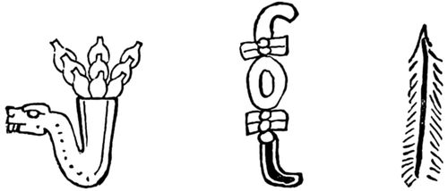 The intermediate position, which I have defended, is that while chiefly ideographic, they are occasionally phonetic, in the same manner as are confessedly the Aztec picture-writings. In these we constantly meet with delineations of objects which are not to be understood as conveying the idea of the object itself, but merely as representing the sound of its name, either in whole or in part; just as in our familiar “rebus writing,” or in the “chanting arms” of European heraldry. I have applied to this the term “ikonomatic writing,” and have explained it so fully, as 14it is found in the Mexican manuscripts, in my “Essays of an Americanist,” that I need not enter upon it further in this connection, but would refer the reader to what I have there written.[7]