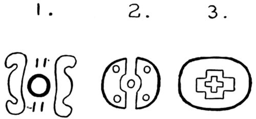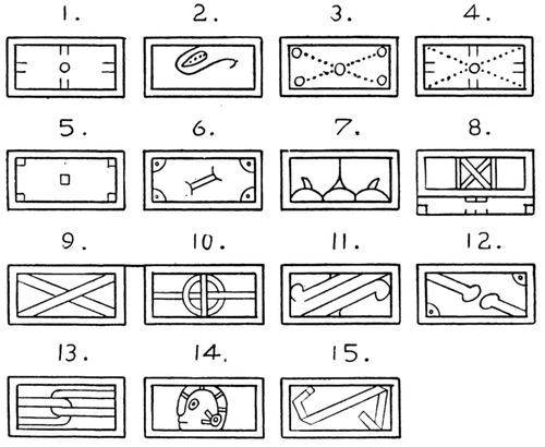 122. A similar design is found on Mexican shields, e. g., Lienzo de Tlascala, plate 12, Cod. Porf. Diaz., lam. s. and on the curious sculptures at Monte Alvan, Oaxaca, figured in Captain Dupaix’s Second Expedition, plate 21, in Kingsborough’s Mexican Antiquities.