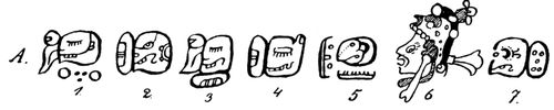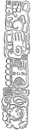 Each separate group of characters is called a “glyph,” or, by the French writers, a “katun,” the latter a Maya word applied to objects arranged in rows, as soldiers, letters, years, cycles, etc. As the glyphs often have rounded outlines, like the cross-section of a pebble, the Mayan script has been sometimes called “calculiform writing” (Latin, calculus, a pebble).