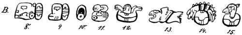 11It will readily be understood that the composite characters may be indefinitely numerous. Mr. Holden found that in all the monuments portrayed in Stephen’s Travels in Central America there are about fifteen hundred;[3] and Mr. Maudslay has informed me that according to his estimate there are in the Dresden Codex about seven hundred.