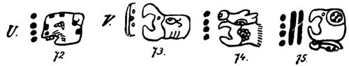 In another work I have explained the numeral system in vogue among the ancient Mayas, as well as the etymology of the terms they employed.[14] It will be sufficient, therefore, to say here that their system was vigesimal, proceeding by multiples of twenty up to very large sums. In the same work I have quoted from original sources the information that the fives up to fifteen were represented by single straight lines and the intermediate numbers by dots. This has also been discovered independently by several students of the manuscripts.