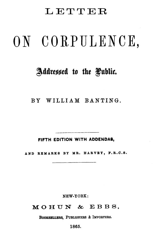 “My patient, Mr. Banting, having published for the benefit of his fellow sufferers, some account of the diet which I recommended him to adopt with a view to relieve him of a distressing degree of hypertrophy of the adipose tissue. I have been frequently urged by him to explain the principles upon which I was enabled to treat with success this inconvenient, and in some instances, distressing condition of the system.