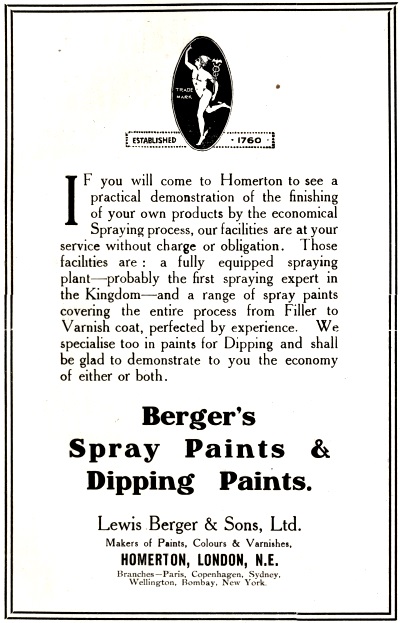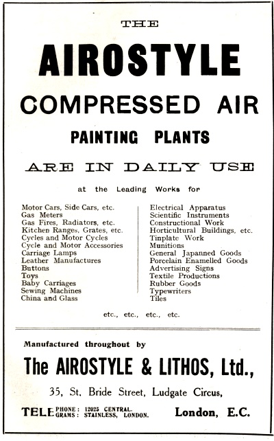 All the principal appliances used for spraying paint, lacquer, enamel, varnish and similar liquids have been described at length, but no attempt has been made to prove that any one appliance is superior to another. The details of each apparatus are given, and for the convenience of the reader, the manufacturer's name and address. It is suggested that those who contemplate the adoption of paint dipping, or spraying, should get into touch with all these firms, and carefully investigate their respective merits before coming to a decision.