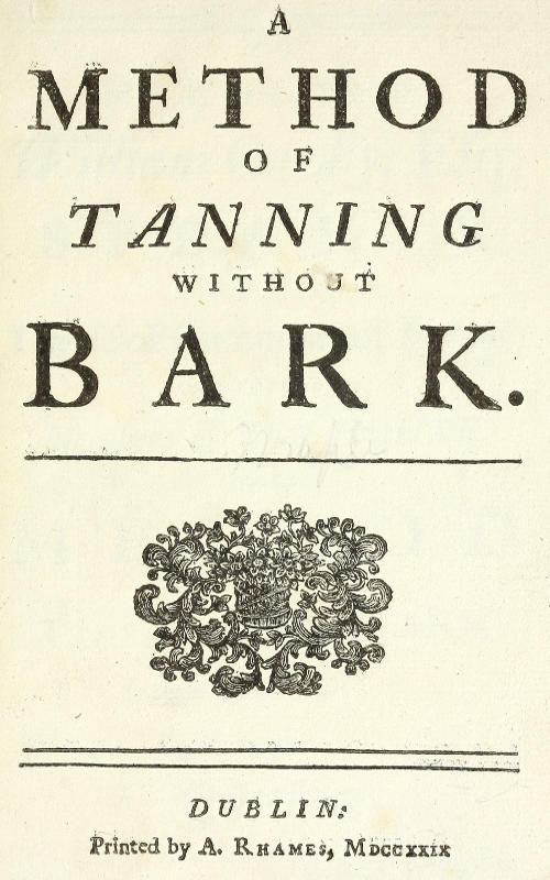 In Order to this, I shall in the first Place beg Leave to place this Affair in the Light it appeared in before the Committee of the House of Commons of Ireland, to whom my Petition was referred by the House, in which Petition it was alledged, that I had established a Method of Tanning, without the Use of any Barks, to as great Perfection, cheaper, and in less Time, than with Bark, by Vegetables of our Natural Produce, and of easy Culture.