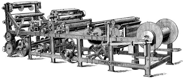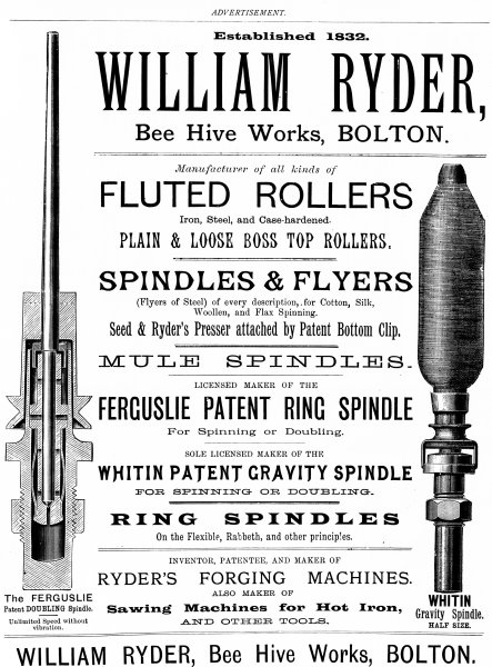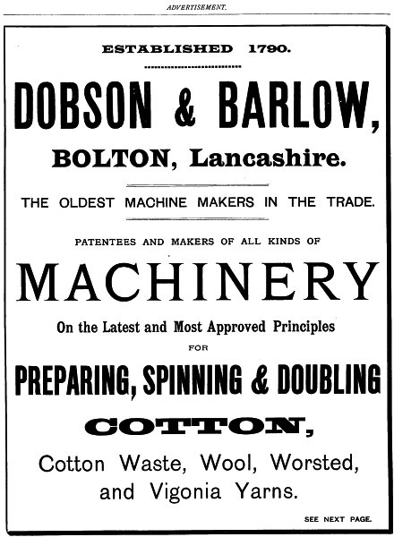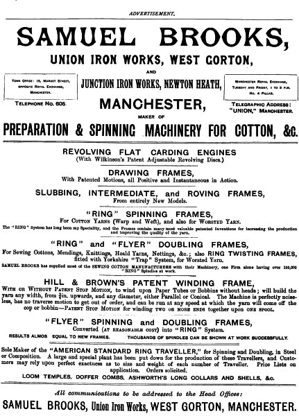 (1) The rapid growth of the cotton trade is in no small degree due to the exertions and ingenuity of the engineers and machinists who have devoted themselves to the subject. It is remarkable how few of the later inventions, at any rate, are those of persons actually engaged in the operations of spinning or weaving. It is quite true that James Smith, of Deauston, forms a conspicuous exception, and that many others could be also named who were at once manufacturers and mechanicians, but the general fact is as stated. To-day, the spinner, who is in a difficulty requiring a mechanical solution, turns the whole matter over to the machinist, who puzzles it out without, in many cases, getting his due reward. It is, however, a general practice for machinists to originate improvements, and the competition in this respect is so keen, that a spinner is never at a loss for a choice of appliances.