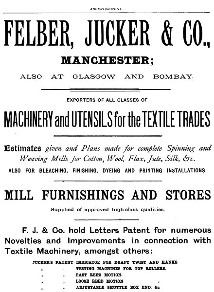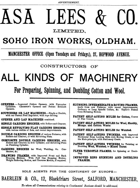 Plans and Estimates of complete New Mills. Practical Mill Managers, Carders and Tacklers engaged for Clients abroad.