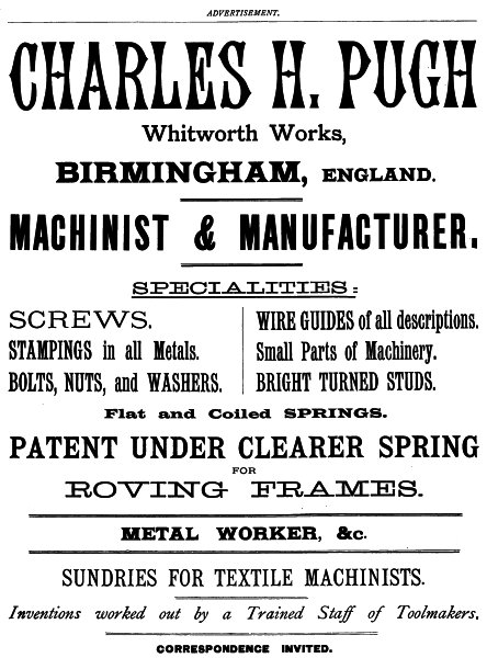 It should be distinctly understood that the mention of any machinist does not imply any approval or otherwise of his particular appliance, but is simply given in order to identify the maker of it, which it is only fair to do. The Author’s opinions can be easily gathered, but it is no part of the scheme to enter into controversy about different methods, or to make the book a treatise on comparative textile mechanics.