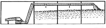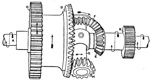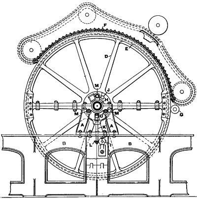 (12) Up to within 15 or 20 years ago the most common mode of transmitting the power developed by the steam engine was by means of toothed gearing. About that period the American method of driving by a series of broad belts was introduced and for a time was largely adopted. When toothed gearing was used the power was conveyed to the various flats or storeys of the mill by means of an upright shaft, on which were bevel wheels gearing with others on the line shafts. The introduction of belt driving led to a system of transmitting the power to the main shaft in each room independently of its fellows, and this system found further development when driving by a series of ropes was adopted a short time afterwards. In this case the power is taken off by a number of ropes working in the grooves of a large pulley on the engine shaft and of smaller ones fixed on the line shafts. This is now the favourite method of driving and is more extensively adopted than any other. The reason for this is principally the ease with which breakdowns can be guarded against. If a rope breaks it falls into the race, and10 in rare instances does it become entangled. It is only necessary to replace it, and any delay thus caused is not great.