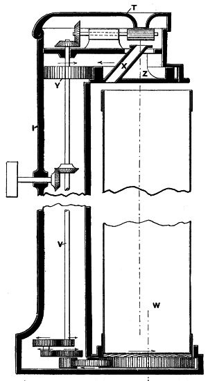 (11) Among the features which deserve mention is the improved type of engines used. In lieu of the old-fashioned beam engine, compounded or otherwise, working at a steam pressure of 50lb. or less, the modern engine is of the horizontal type. The favourite class for mill driving is the tandem compound, in which the high pressure cylinder is behind the low-pressure, but on the same bed. Latterly the vertical triple expansion engine has been adopted in a few cases, and there is a continual tendency towards higher steam pressures and more9 expansions. The introduction of steel boiler plates has rendered the construction of steam boilers for high pressures much more easy, and the author has seen a Lancashire boiler, intended for habitual use at a pressure of 220lb., tested with highly satisfactory results. Within limits, therefore, there is room for a further increase from the normal working pressure of 80lb. The steam-engines used are mostly of the Corliss type, with quick cut-off gear of high efficiency, and they are constructed to develop in many cases from 1,000 to 2,000 horsepower. The water used for condensing purposes is stored in reservoirs or “lodges,” from which it is drawn as required. It is sometimes difficult to cool it sufficiently to get a good vacuum, owing to the fact that the cooling and storage space is insufficient. For this purpose a type of condenser known as Theisen’s, which has been largely adopted in Germany and is now being introduced into this country, will be of value. It is arranged as a surface condenser, the steam passing through the tubes and being cooled by water surrounding them. In lieu of giving the water a circulatory movement it always remains in one position, any loss by evaporation being replaced. Between each vertical row of pipes cast-iron discs revolve, which are fixed on a shaft suitably driven. As each disc dips into the water—which is usually about 160 deg. F.—it picks up a thin film and carries it round in its revolution. At the upper part of the case, in which the discs revolve, an air propeller is fixed, which sends a current of air past and through the spaces between the discs. This leads to a rapid cooling of the disc and its water film, the heat absorbed by the water being in this way dissipated. The action is one of evaporative cooling, of which many instances abound, and is very effective. An equal weight of water will effectually condense any given volume of steam, and this quantity is not difficult to find in most places. The results obtained by the Union Engineering Company in this country have been satisfactory, and there appears to be no doubt as to the efficacy of the machine. Steadiness of rotation is a sine qua non in mill engines, a very slight difference in their velocity having a great effect upon the work of the mill. This is now attained in most cases with certainty, and by means of the Moscrop Recorder—an instrument denoting graphically the changes of speed—a very salutary check is kept upon the engineer. In order to prevent any variations occurring high-speed governors are largely employed, and in some cases their action is aided by special means, such as Knowles’s supplementary governor or Higginson’s patent regulator. Either of these appliances give good results, and the last named is very simple and effective.