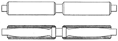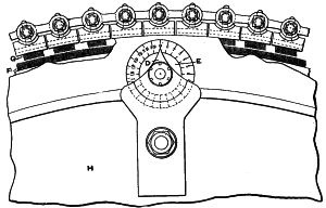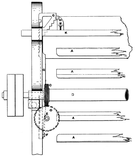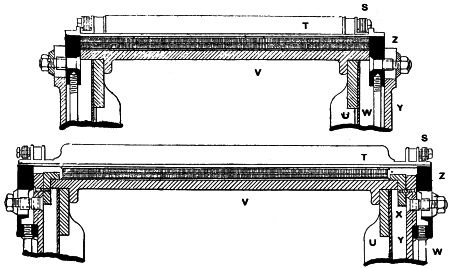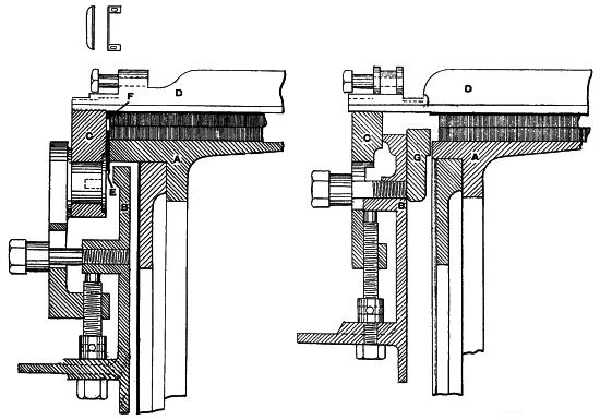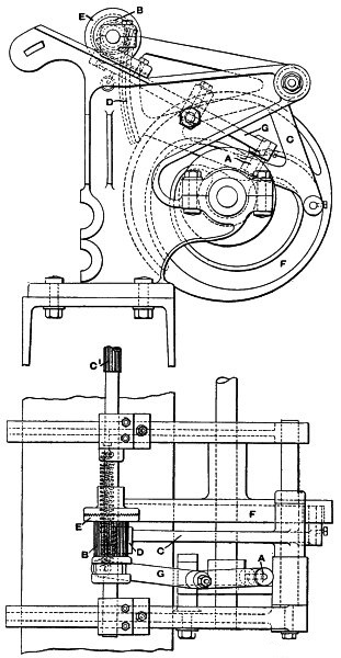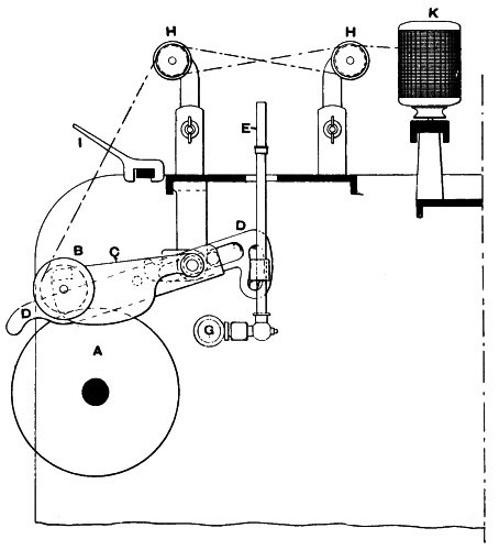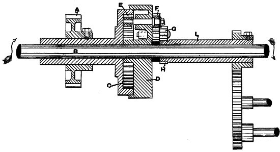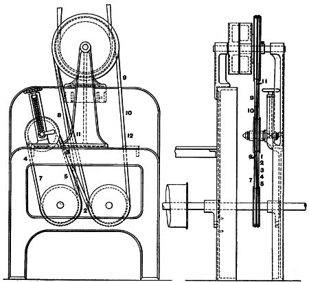 (14) As this subject of rope driving is an interesting one, it is worth noting that Mr. George Goodfellow, of Hyde, who has had a wide experience in this matter, confirms the advice as to small diameter of ropes. In the same discussion he stated that he did not now use larger diameters than 13⁄4 inch, and had ropes running successfully, the diameter of which was only 11⁄4 inches. Mr. James Hartley also bore out this experience. By the reduction of ropes from 2 inches to 11⁄4 inches diameter the friction diagram from the engine had been materially reduced, indicating a saving of power. Mr. J. H. Ratcliffe, of Dukinfield, has recently revived a method by which, instead of using a series of ropes, he uses one only, this being endless, and being wrapped spirally on the pulleys. At one point the slack is taken up by a compensating apparatus, so that the whole of the coils are tight back and front instead of having one side slack and bellying. For this arrangement Mr. Ratcliffe claims that it materially reduces the friction diagram, inasmuch as there is no necessity to drag the rope forcibly out of the grooves at each revolution. It is not necessary for a detailed examination of this subject to be made, but the hints given will probably prove useful to many readers.