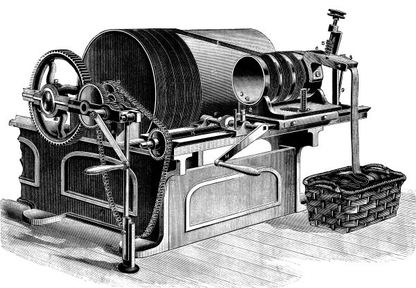 (9) A comparison of the speeds of various machines will demonstrate the value of improved construction. Mule spindles, which in 1834 were run at a maximum velocity of 4,500 revolutions per minute, are now revolved 11,000 times per minute with much greater ease and freedom from vibration. The throstle spindles running at a speed of 4,500 revolutions, are superseded by ring spindles, which rotate from 9,000 to 11,000 times per minute. As shown in Chapter XII, it would be impossible to attain such a velocity unless the spindles were accurately constructed by special tools. Although the mechanism of a ring spindle is much more elaborate than that of a throstle spindle, the cost of the one but little exceeds that of the other. Again, a carding engine cylinder, formerly made of wood, and running 80 to 100 revolutions, is now constructed entirely of iron, and revolved at from 160 to 180 times per minute. In spite of this increase it is more free from vibration than its slower running predecessor. A similar comparison can be made of every machine with like results, but it is not necessary. Enough has been said to show the important part played by the machinist, to whom, as was pointed out in paragraph 1, most of the credit is due. The economical improvement which is noticeable in the condition of the workpeople is largely the result of the improvements made in the machinery. In fewer hours more work can be turned out, and this with a constantly decreasing strain upon the operatives. The breakage of the fibres in the various stages of manufacture is reduced to a very low point, with the twofold advantage of diminished waste and decreased labour.