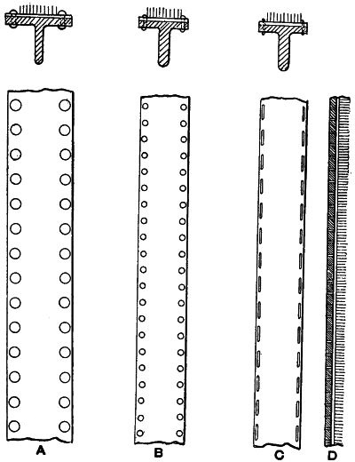(7) It is not necessary to pursue this matter further, as the present work is not intended as a statistical abstract, but the few facts stated show that in the general march of improvement the textile mechanic has not been idle. A consideration of the methods of construction adopted to-day, as compared with those in vogue even so recently as twenty years ago, will further demonstrate this fact. Formerly the work of construction was very largely if not mainly carried out by fitters who were engaged in manually shaping the brackets and fitting them to the frames. The brackets were formed with feet, on which were cast nipples or projections. These were used to reduce the labour in filing, and, as the bracket was always fitted on to the face produced in the ordinary operation of casting, it will be seen that anything tending to diminish the work of fitting was valuable. But as the bedding of the brackets was dependent upon the proper shaping of a few points, the tendency to slip was considerable. Although, by being always engaged in fitting a few patterns of brackets, the workmen became extraordinarily expert, the method was at best an uncertain one, and did not lead to the rigidity absolutely essential in high-speed machines.
