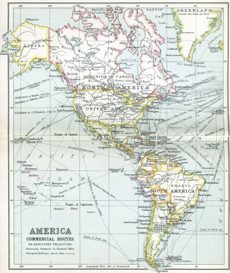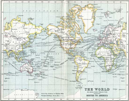 | The World on Mercator's Projection, showing Routes to America | 24, 25 |