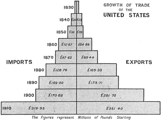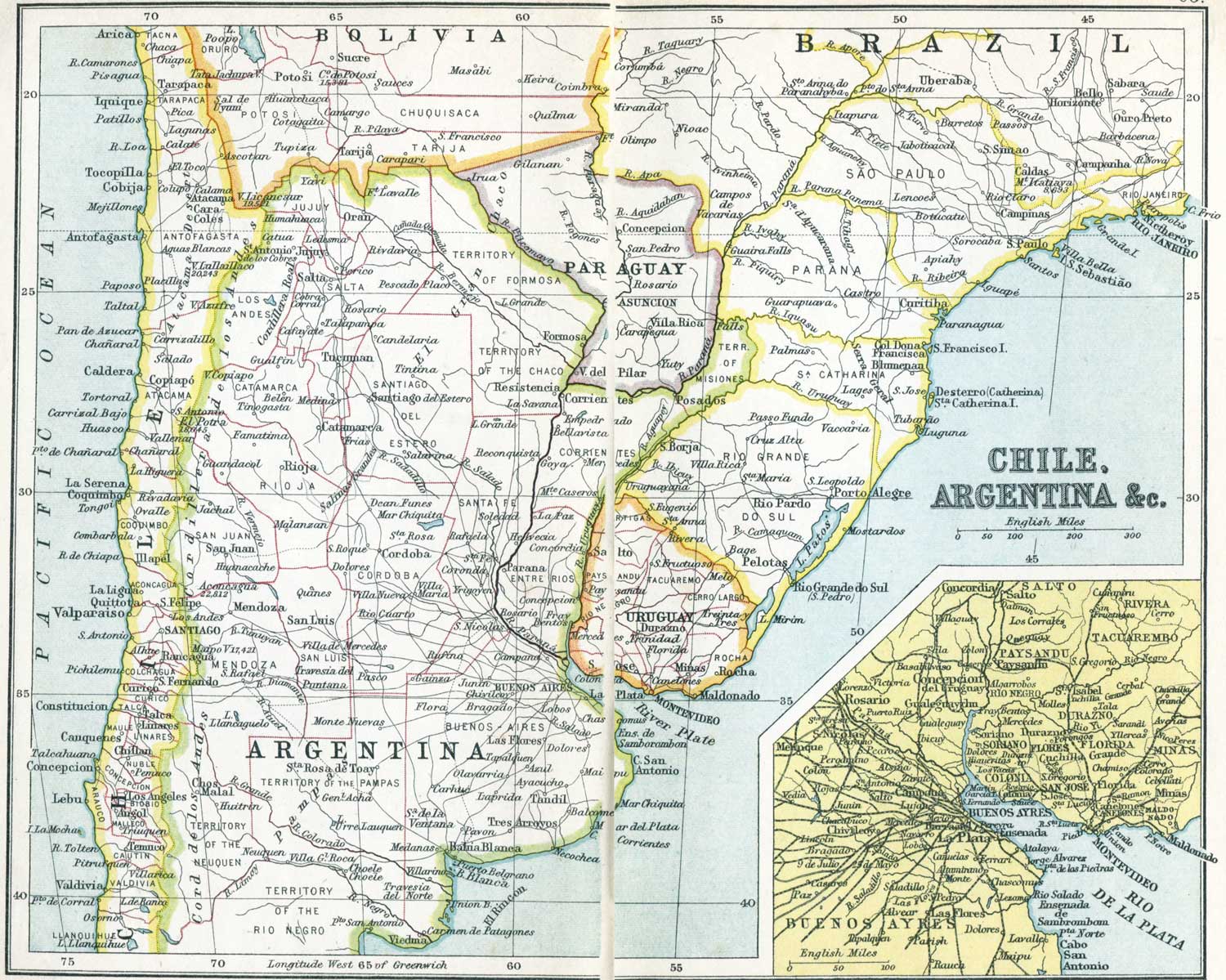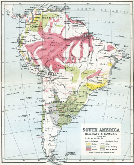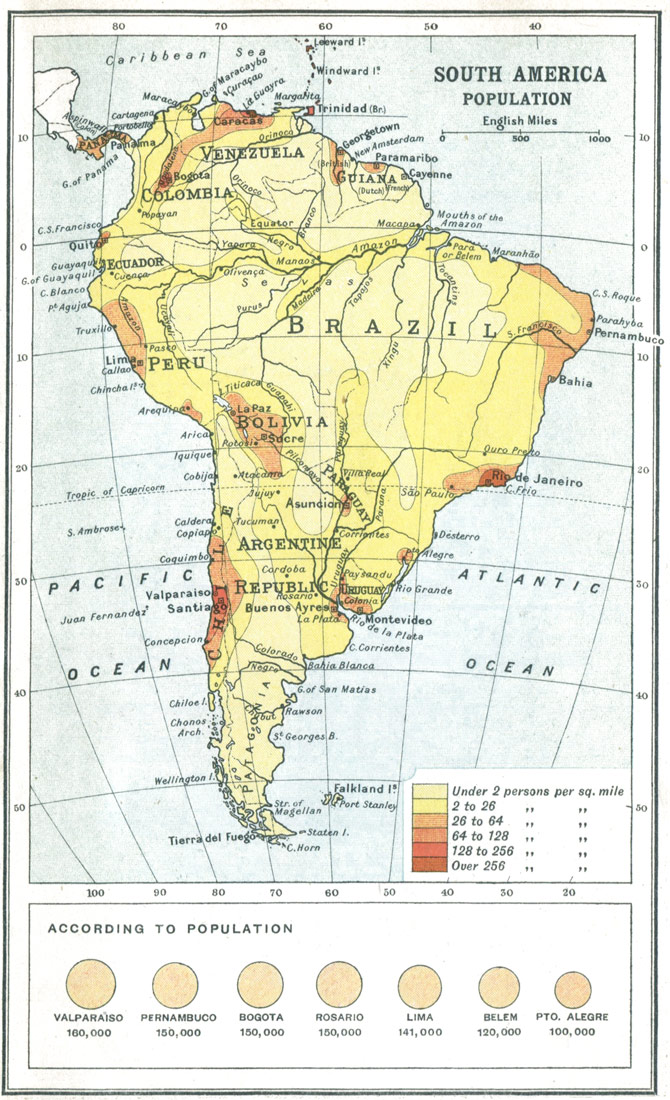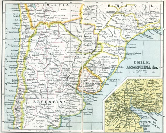 As for the local associations that have become familiar in American literature, you have a chart of the Concord neighbourhood showing Walden Pond, Forest Lake, Lexington, and Punkatasset Hill, associated with the name and fame of Ralph Waldo Emerson, Nathaniel Hawthorne, and H. D. Thoreau. Fenimore Cooper recalls the old Indian Territory as it was in the wild prime of the Red Men; and you travel from the land of "Hiawatha" in Longfellow's poem southwards to the Mexico and Peru of Prescott, and then pause over something more amazing than any record in imaginative verse or prose—the plain statistics figured in the map of South America, and the emergence of Buenos Ayres with its million and a quarter inhabitants, Rio de Janeiro with its 860,000, San Paulo with 350,000, and Santiago with 330,000. Here are the elements of an immense new Latin civilisation which is going to count, and count enormously, just as China and its millions are bound to count enormously in the twentieth century.