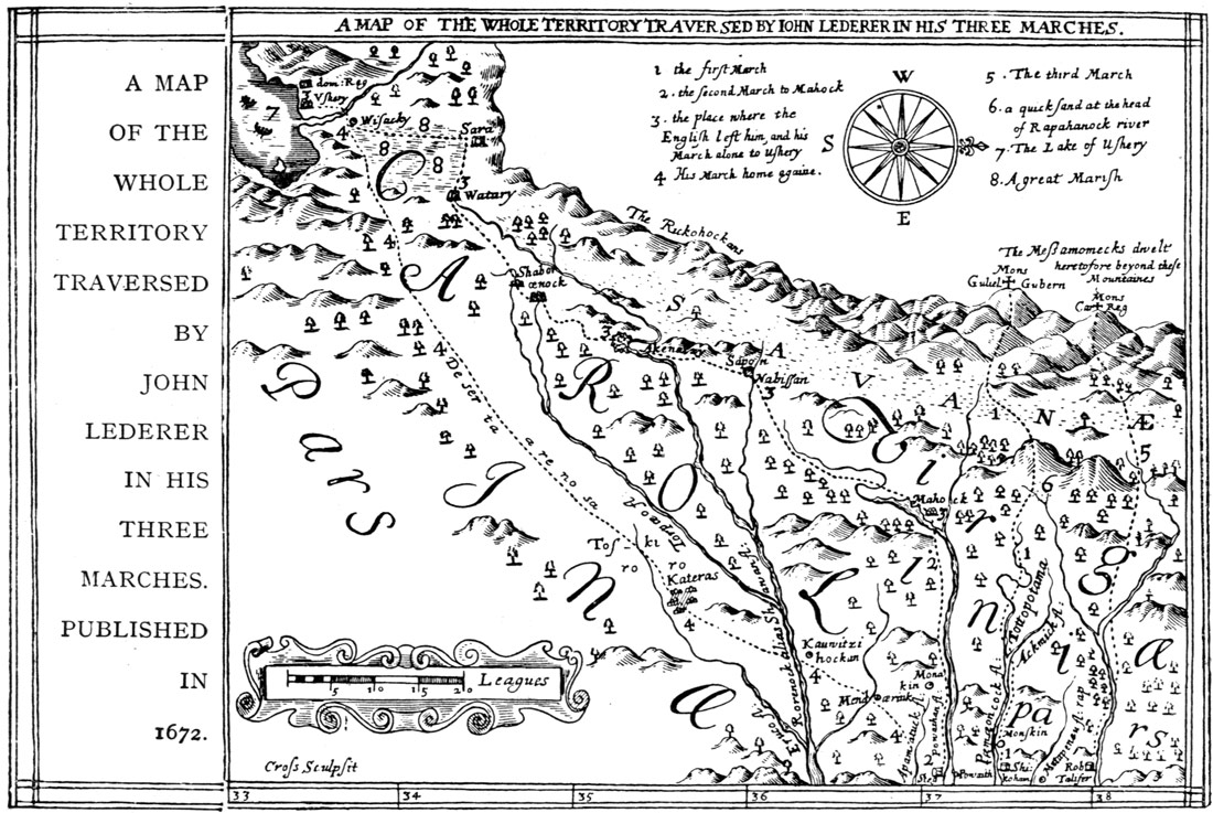 Note among the less familiar documents that we are able to include, the rare map of the territory in Virginia and North Carolina traversed by John Lederer in his three marches. Lederer was sent out by Governor Berkeley in 1669-70, and journeyed west as far as the top of the Apalatœan mountains. It seems doubtful how far he went in South Carolina. He did not penetrate far enough, according to Professor W. J. Rivers, to meet "the new-comers who were about founding the Commonwealth of Locke."