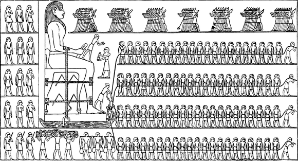 Fig. 1 zeigt die Fortschaffung des Standbildes des Dhutotep durch die Krieger und die Stadtleute des Hasengaues. Das Standbild ist auf einen hölzernen Schlitten gestellt, der auf einer ebenfalls hölzernen Bahn gleitet. Vier Reihen von Arbeitern ziehen mittels Tauen den Schlitten vorwärts. Ein Mann gießt Wasser auf die Bahn, drei weitere bringen Wasser hinzu. Ein Mann steht auf den Knien der Statue und gibt von diesem erhöhten Standpunkt durch Händeklatschen das Signal zum taktmäßigen Anziehen. Mit welchen Menschenmassen bei diesen Transporten gearbeitet wurde, geht aus einer Mitteilung hervor, wonach zur Fortschaffung eines Steinblockes von 4,2 m Länge, 2,1 m Breite und 1 m Höhe 3000 Leute verwendet wurden.