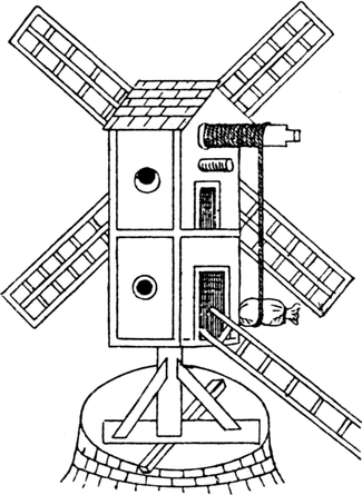 Fig. 10 (entnommen aus Beck S. 277) zeigt zum erstenmal eine Hebemaschine, die durch Naturkraft betrieben wird. Die Einzelkonstruktion ist nicht sichtbar, es ist aber zu vermuten, daß die[S. 17] Trommelwelle parallel zur Windradwelle so gelagert ist, daß durch Reibungsräder die Übertragung von der letzteren auf die Trommelwelle stattfindet, sobald die Reibräder aneinander gepreßt werden. Wir haben also anscheinend die Urform der sog. Friktionswinden vor uns, die geradezu typisch für Mühlenaufzüge geworden sind.