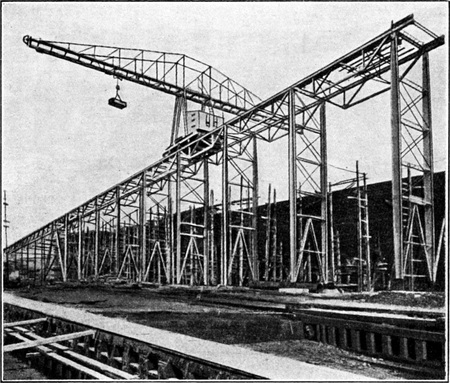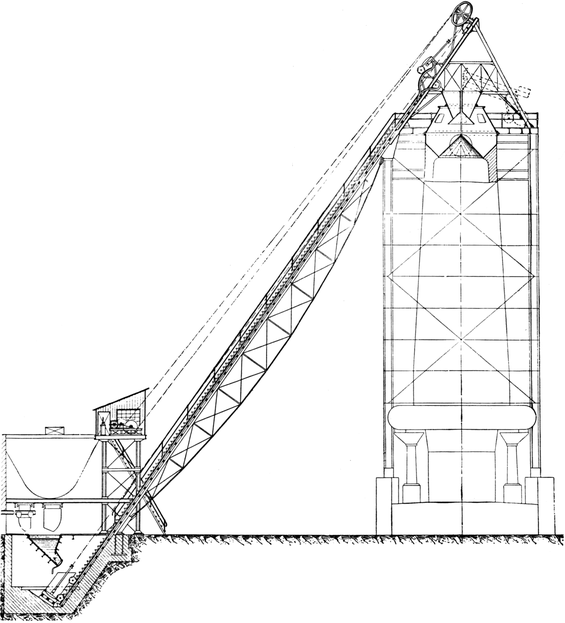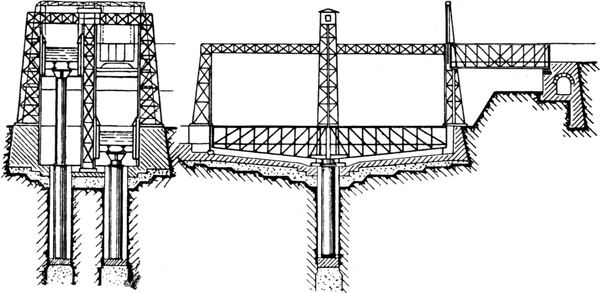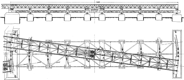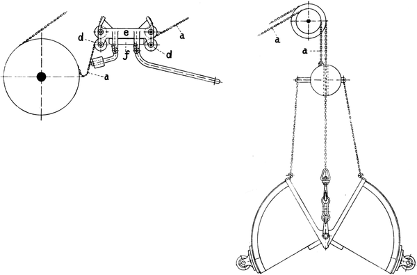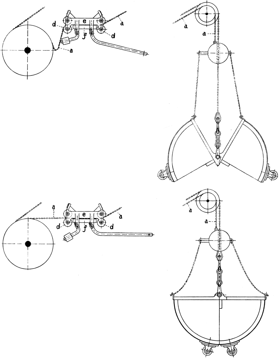 Fig. 17 (entnommen aus Beck S. 481) gibt eine Darstellung von zwei übereinander an demselben Stützgerüst angeordneten Drehkranen, zu dem Ausheben eines Kanals bestimmt. Die durchaus zweckmäßige Anordnung des Gerüstes mit den wohldurchdachten Einzelheiten ist besonders bemerkenswert. Auch der Arbeitsvorgang ist gut überlegt: er gestattet ein gleichzeitiges Arbeiten in zwei Geschossen und ein stetiges Vorrücken der ganzen Maschine.