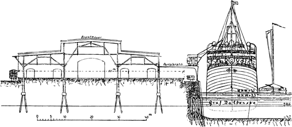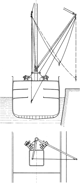 Fig. 16 (entnommen aus Beck S. 447) stellt zwei Wand-Drehkrane vor, von denen der eine an einem Gebäude, der andere an einem Strebenwerk gelagert ist. Letzterer ist so aufgestellt, daß er die Umladung aus Schiffen eines tiefliegenden Kanals in einen hochliegenden bewirken kann: er ersetzt also bis zu einem gewissen Grade eine Schleuse.