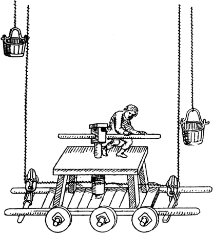 In dieser Handschrift sind die ersten fahrbaren Winden und Krane dargestellt. So zeigt Fig. 11 (entnommen aus Beck S. 284) eine fahrbare Bauwinde, die durch ein Gangspill betrieben wird und von zwei Lastseilen das eine aufwindet und gleichzeitig das andere senkt.