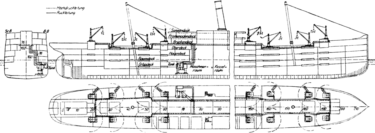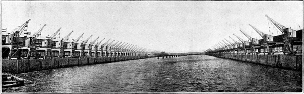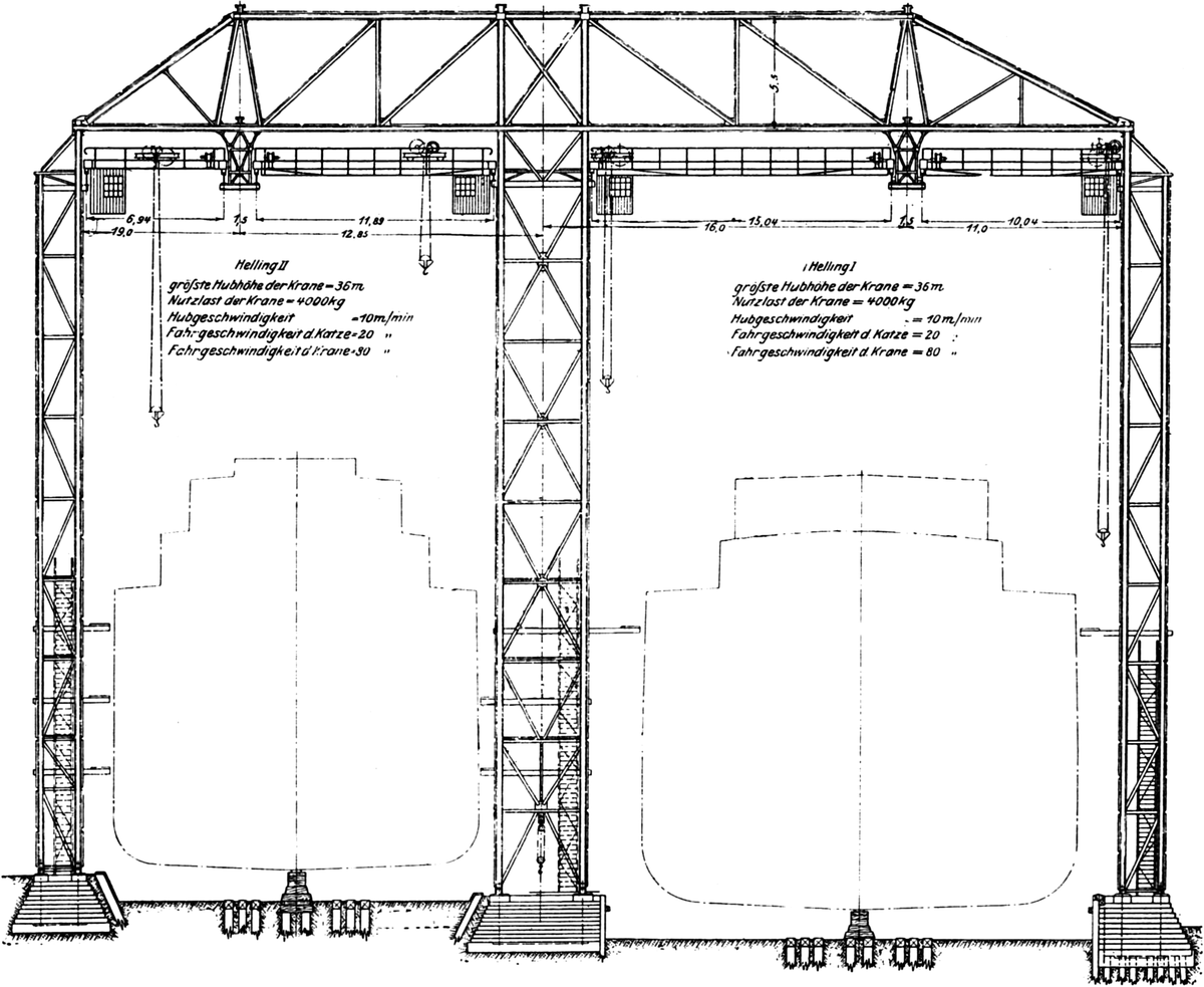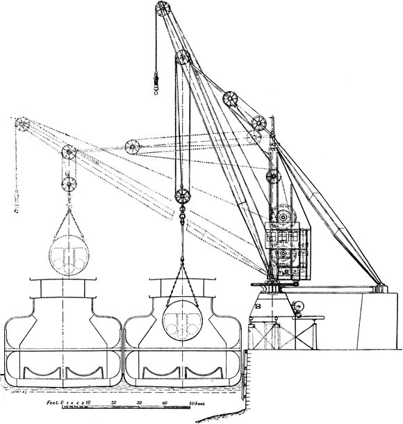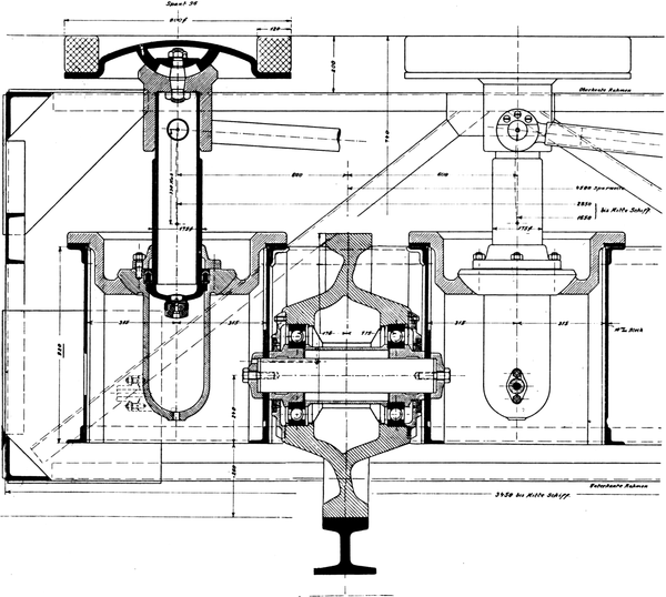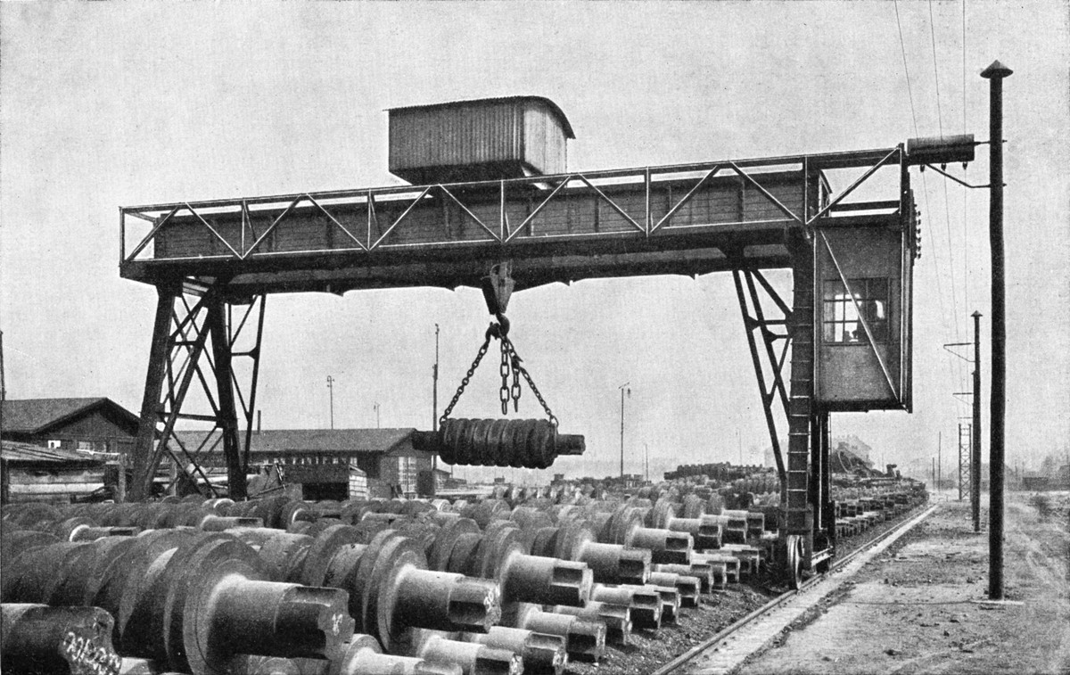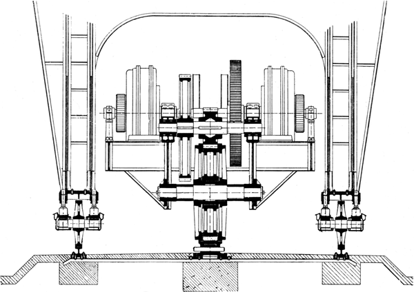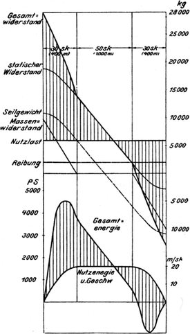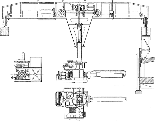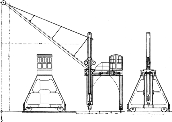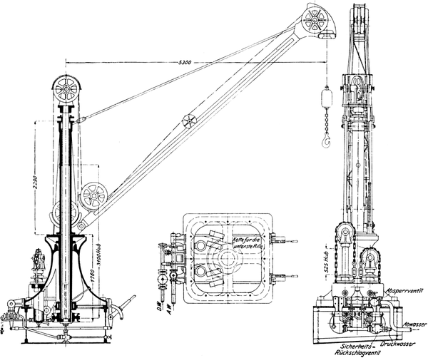 Eine völlig neue Periode begann erst mit der Beherrschung der Dampfkraft und mit ihrer Anwendung auf den Lastentransport. Die Dampfmaschine selbst stammt zwar schon aus dem Ende des 18. Jahrhunderts, die Einführung der Dampfkraft in den Landverkehr fällt aber erst in das Jahr 1829, ihre Anwendung für Fördermaschinen[S. 5] ungefähr in dieselbe Zeit und ihre Verwendung für Krane erst in die Mitte des 19. Jahrhunderts. Die unmittelbare Anwendung der Dampfkraft für Hebemaschinen blieb auch in der Folge auf Sondergebiete wie Fördermaschinen, Schiffswinden und Kaikrane beschränkt; denn Hebemaschinen mit eigenem Dampfkessel waren schwerfällig und kostspielig, während der Anschluß an zentrale Kesselanlagen durch lange Dampfleitungen hohe Instandhaltungskosten mit sich brachte. Das Bedürfnis nach einer zweckmäßigen Energieverteilung machte sich lebhaft geltend. In der zweiten Hälfte des 19. Jahrhunderts tauchten zahlreiche Bestrebungen dieser Art auf: Seilübertragung, Druckwasser und Druckluft wurden in vielen Ausführungen zur Energieverteilung benutzt. Von diesen Übertragungssystemen errang indessen kein einziges eine allgemeine Verbreitung, weil alle zu geringe Beweglichkeit besaßen und zu wenig für Fernübertragung geeignet waren. Es wurden daher bis zum Ende des 19. Jahrhunderts noch zahlreiche Hebemaschinen mit Handbetrieb ausgeführt.