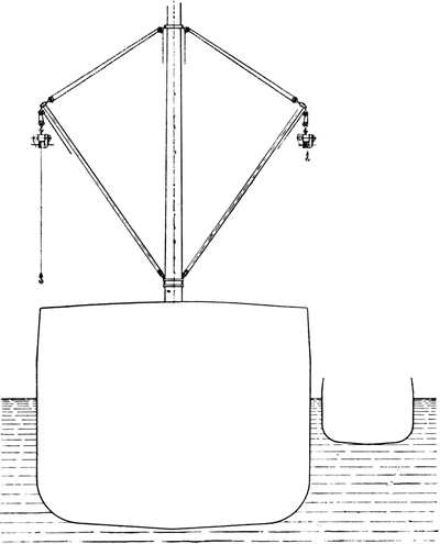 Aus der römischen Zeit liegt gegenüber der griechischen nichts wesentlich Neues auf dem Gebiet der Hebemaschinen vor, denn nach dem eigenen Zeugnis des Marcus Vitruvius Pollio (um 16 vor Chr.) hat dieser in seiner Darstellung nur zusammengetragen, was er in griechischen Werken bereits vorfand. Die Figurentafeln des Vitruv sind verloren gegangen, nachstehend eingefügte Figuren sind den Rekonstruktionen von Theodor Beck entnommen. Fig. 6 (entnommen aus Beck S. 42) stellt einen Wippkran vor, wie er heute noch als allereinfachstes Hilfsmittel zum Heben von Lasten an Baustellen benutzt wird. Mit der schon erwähnten Beschreibung eines einmastigen Wippkrans (Monokolos) von Pappus stimmt folgende Darstellung des Vitruv überein: »Es gibt außerdem noch eine andere ziemlich sinnreiche Art von Hebemaschinen, welche den Vorteil der Arbeitsbeschleunigung bietet, die aber nur von kundigen Leuten gehandhabt werden kann. Man stellt nämlich nur einen Baum auf und spannt ihn auf vier Seiten mit Haltseilen fest, unter den Haltseilen befestigt man zwei Backen (Auffütterungshölzer), knüpft die Flasche mit Seilen über denselben fest und legt der (oberen) Flasche ein etwa zwei Fuß langes, sechs Zoll breites und vier Zoll dickes Querholz unter. Die Flaschen werden so eingerichtet, daß die Rollen zu je drei nebeneinander laufen. Nun werden drei Zugseile an der oberen Flasche festgeknüpft, dann zur unteren Flasche herabgeführt und von innen um die drei oberen Rollen derselben geschlungen, dann werden sie wieder zur oberen Flasche hinaufgeführt und von außen nach innen über[S. 14] die unteren Rollen derselben geschlungen. Wenn dann die Seile wieder auf den Boden herab gelangt sind, schlägt man sie von innen nach außen über die drei Rollen, die an zweiter Stelle stehen, führt sie wieder nach oben, zu den zweiten Rollen daselbst, schlingt sie über diese, führt sie abermals nach unten und von unten noch einmal nach oben, und nachdem sie über die obersten Rollen geschlagen sind, leitet man sie bis an den Fuß des Hebebocks (Standbaums). Am unteren Ende der Maschine aber ist ein drittes Rollengehäuse angebracht, welches die Griechen Epagon (Zieher), wir Römer aber Artemon (Leitflasche), nennen. Dieses Rollengehäuse wird am Fuße des Standbaumes festgeknüpft und enthält drei Rollen, um welche die Seile geschlungen werden und dann ihre Enden den Leuten zum Ziehen darbieten. So können ohne Göpel drei Reihen von Leuten ziehen und die Last wird schnell in die Höhe gebracht.