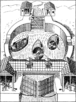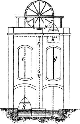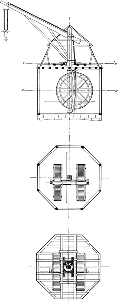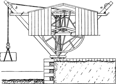 Auf diese Bestrebung, die Arbeit des Lastenhebens in eine den menschlichen Muskeln besser angepaßte Form zu bringen, beschränken sich alle Ausführungen bis zum 15. Jahrhundert. Tierkraft und Wasserkraft waren zwar schon den Römern bekannt, wie[S. 4] uns Markus Vitruvius Pollio um 16 v. Chr. berichtet, aber Pferdegöpel und Wasserrad wurden damals nur zum Betrieb von Mahlmühlen verwendet und selbst diese ließ man lieber durch Sklaven betreiben, die in dem günstigen Klima Italiens billiger zu beschaffen und zu unterhalten waren als Pferde und hölzerne Maschinen.
