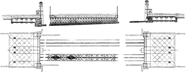 Als Abschluß der ersten Epoche — die durch ausschließliche Verwendung von Menschenkraft für Heben von Lasten gekennzeichnet[S. 20] ist — mögen zwei Figuren beigegeben werden, die den Transport des Vatikanischen Obelisken darstellen, der durch Domenico Fontana im Jahre 1590 ausgeführt wurde und wobei zum erstenmal Pferdegöpel verwendet wurden. Theodor Beck gibt auf S. 485 und den folgenden eine ausführliche und sehr anziehende Darstellung des Vorgangs nach dem eigenen Bericht des Domenico Fontana.
