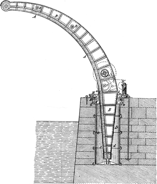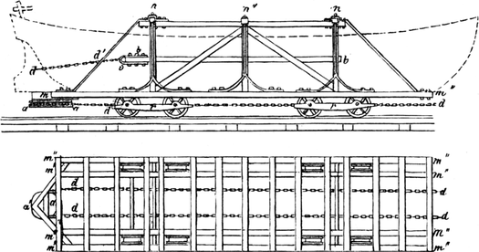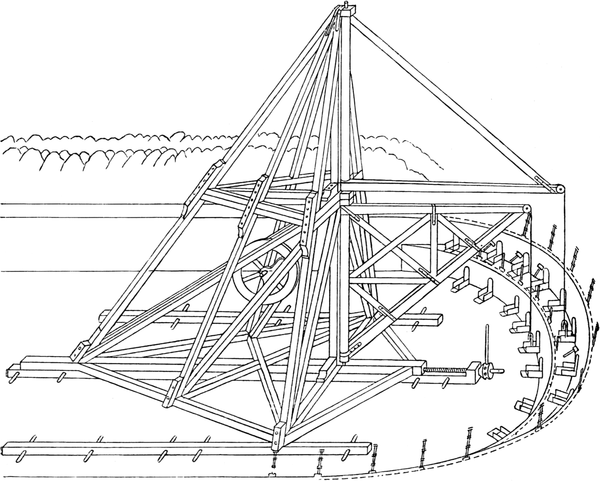 Der mit einer Holzverschalung und eisernen Bändern armierte Obelisk wurde durch 40 über die ganze Länge verteilte Flaschenzüge gefaßt, deren Taue zu 40 Pferdegöpeln führten. Die Seile waren an den Trommelwellen der Göpel nicht befestigt, sondern nur durch Reibung mittels mehrfacher Umschlingung gehalten, um eine einfache Regelung der Seilspannung zu ermöglichen.
