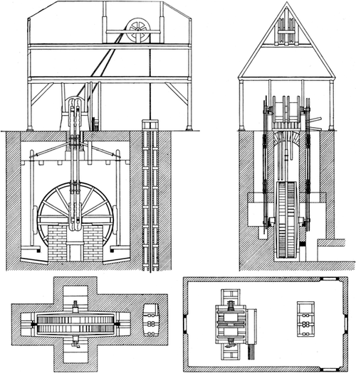 Ein Wandel trat erst um das Jahr 1500 ein. Um diese Zeit war der Bergbau in Deutschland so weit entwickelt, daß er aus dem Tagebau der antiken Zeit zu einem Tiefbau mit Schacht und Stollen sich umgebildet hatte. Es lag daher das Bedürfnis vor, das gewonnene Erz aus Teufen bis zu 200 m zu heben. Die Verwendung von Menschenkraft hierfür würde in dem Klima Deutschlands zu kostspielig gewesen sein. Es war darum notwendig geworden, Naturkräfte in den Dienst des Förderbetriebes zu stellen. Anschauliche Zeichnungen von Göpel-Fördermaschinen und von Wasserrad-Fördermaschinen sind uns in dem Werk »Bermannus« von Agricola überliefert.
