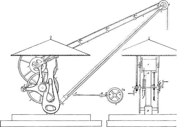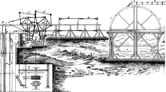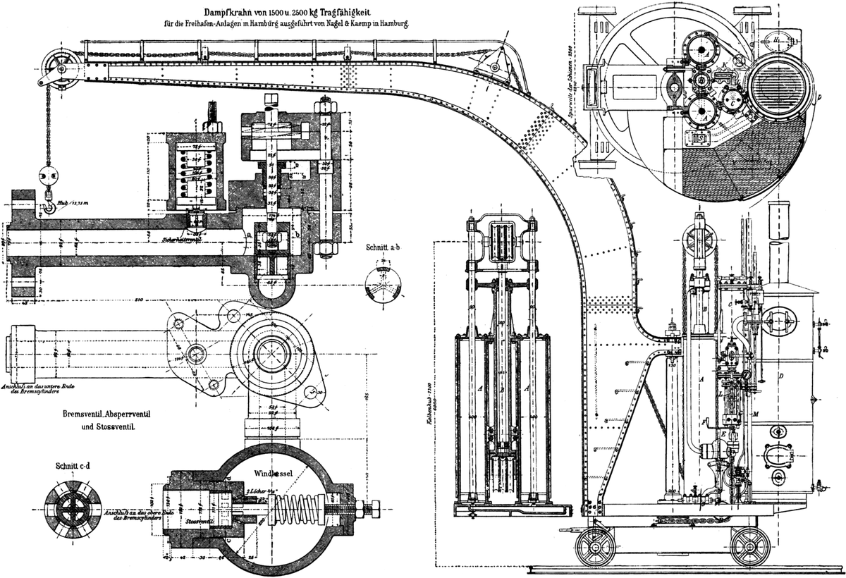 Die Anwendung dieser Naturkräfte für Hebemaschinen anderer Art, etwa für den Umschlag vom Schiff auf das Landfahrzeug war kaum möglich, denn die Wasserkraft war überhaupt nur in bergigem Gelände verfügbar und ebenso wie der Tiergöpel zu schwerfällig und sperrig für den beschränkten Raum am Kai. Wir finden daher vom Jahre 1500 bis gegen die Mitte des 19. Jahrhunderts keinen wesentlichen Fortschritt. Die Zeichnungen von Fördermaschinen und von Kaikranen aus dem Beginn des 19. Jahrhunderts sehen fast genau so aus wie diejenigen aus dem 15. Jahrhundert; nur die Abmessungen sind mit den zunehmenden Teufen und Lasten etwas gewachsen.
