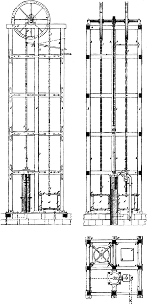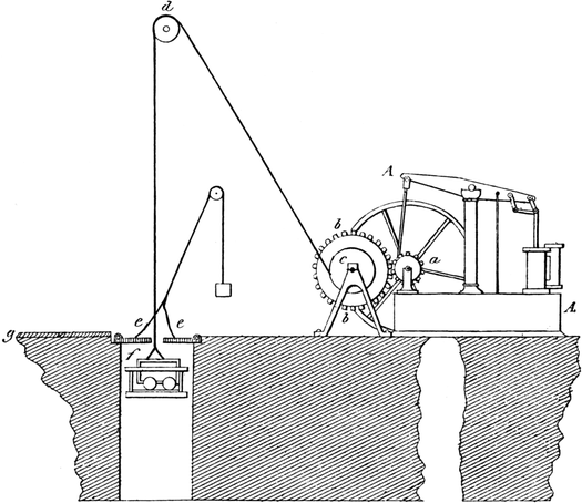 19. Jahrhundert: Vom Jahr 1820 bis zur Einführung der elektrischen Kraftübertragung in den Hebemaschinenbetrieb um das Jahr 1890.