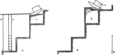 Neuerdings hat Choisy an vorgefundenen Resten und Spuren Untersuchungen über die Entstehung der egyptischen Bauten angestellt und in dem Buch »L’art de bâtir chez les Egyptiens« dar[S. 10]gelegt. Aus diesen Forschungen geht zunächst hervor, daß schwere Lasten durch eine große Zahl gleichzeitig angreifender Hebel mit Gewichtsbelastung gehoben wurden (Fig. 2, entnommen aus Choisy, S. 76), wobei nach jeder Hebung die Unterstützungspunkte der Hebel durch Aufschütten von Erde höher gelegt wurden, während die Last selbst auf einer Erdschüttung aufruhte. Einzelne Quadern wurden durch wiegenartige Wälzungshebel abwechselnd gehoben und durch Unterlagen zeitweise unterstützt. (Fig. 3, entnommen aus Choisy, S. 82.) Die Aufstellung von Monolithen ging in der Weise vor sich, daß sie in wagrechter Lage zunächst durch Hebel stufenweise gehoben und auf vorübergehend aufgestellte Mauern gelagert wurden. (Fig. 4, entnommen aus Choisy, S. 124.) Dann ließ man das untere Ende des Monolithen auf einem Mauersektor heruntergleiten, wobei[S. 11] die stützende Erdschüttung allmählich entfernt wurde. Schließlich wurden Sandsäcke unter den Fuß gelegt, die stützenden Hölzer durchgesägt und nun die Sandsäcke allmählich entleert, so daß sich der Steinblock ohne Stoß auf sein Fundament aufsetzte.