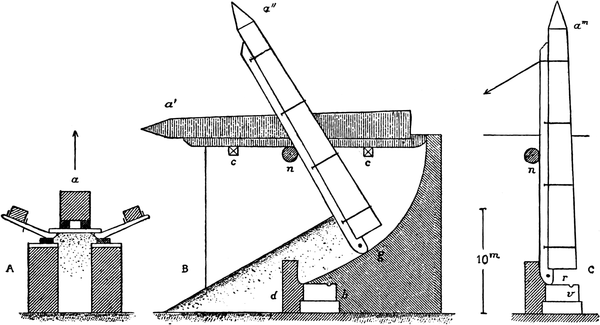 Dieser Transport war für die damalige Zeit eine Aufgabe von besonderer Schwierigkeit. Der Obelisk mußte auf seinem alten Platz umgelegt, auf den rund 200 in entfernten Petersplatz gebracht und dort wieder aufgerichtet werden. Das Gewicht des Monolithen betrug[S. 22] rund 300 t. Fontana löste die Aufgabe sehr zweckmäßig dadurch, daß er den Obelisken nicht um seine Fußkante, sondern um seine Schwerpunktsachse kippte und gleichzeitig den Schwerpunkt vertikal senkte, so daß der Fuß des Obelisk stets in einer Horizontalbahn sich bewegte. Der Vorgang ist aus Fig. 18 (entnommen aus Beck S. 493) deutlich erkennbar.