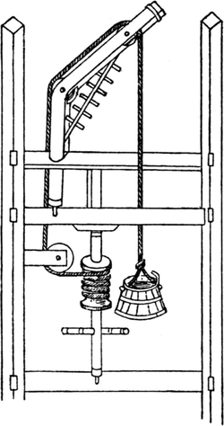 Versuche, dem Menschen die Arbeit der Lastenförderung abzunehmen oder sie wenigstens in eine minder harte Form zu bringen, sind uralt: sie reichen in die Vorzeit zurück. Solange keine Naturkraft — Wasserkraft und Wärme — zur Verfügung stand, konnte nichts anderes geschehen als eine Umwandlung der harten Arbeit des unmittelbaren Schleppens und Tragens in die minderanstrengende Arbeit des Drehens eines Speichenrades, einer Kurbel oder eines Gangspills.