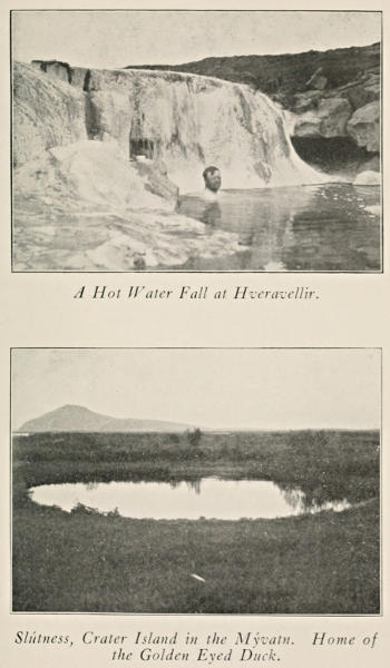 The valley of Reykholt contains many excellent hot springs, some of which have lost part of their former power and do not spout because of the disarrangement of their tubes by recent earthquakes. On a quiet day steam rises from many places in the valley and along the banks of the river. There is one spring of unique formation and peculiar in its situation, the Áhver, River-Hot-Spring. It is in the middle of the river that divides the valley. The river is broad but shallow and the water is cold. In the middle of the stream rises the mound of the hot spring several feet above the water. This mound contains three orifices out of which boiling water pours vigorously. We waded out to this hot mound and climbed to the top. There is no danger of being scalded because the springs no[297] longer spout as in former days on account of the before mentioned earthquake, which has disturbed the tubes. In place of the former periodical spouts of hot water there is now a continuous flow in which the water rises one or two feet above the mouth of the tubes and escapes with much spluttering and accompanied with large volumes of steam. These tubes are a foot or more in diameter. It is a singular location for a hot spring but there is another phenomenon even more surprising. Below the mound of geyserite in the channel of the river there is a long series of holes in the river bed out of which boiling water spurts with such violence in places as to eject steam up through the cold water. Our ponies in fording this stream were quite shy of these hot holes in the bed of the river and insisted on going far down stream.