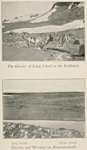 This view is of great interest and beauty and I gazed longingly to the peaks that enclose Thórisdalr, Thief’s-Dale, and desired to climb those ridges of tumbled moraine and examine that great wall of eternal ice that hangs above. The lack of sufficient time made it impossible. This pleasure was experienced in 1913 when I came into Kaldidalr, Cold-Valley from the opposite direction, having pitched my camp at Brunnar, Springs, for several days. This view from Kalmungstúnga leaves no doubt in the mind of the traveller that he is in the land of ice; but when he turns towards the west, passes into the green valley of the Hvitá and comes into close proximity with the numerous hot springs scattered over the plains and along the banks of the river a more temperate climate is suggested.