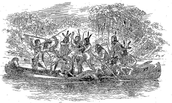 Seeing how desperate the case was, Dale resolved upon a desperate remedy. He called for volunteers for a dangerous piece of work, and was at once joined by Jerry Austill, James Smith, and a negro man whose name was Cæsar. With these men, he leaped into the little canoe, and paddled toward the big Indian boat, meaning to fight the nine Indians who remained in it, although he and his canoe party numbered only four men all told.