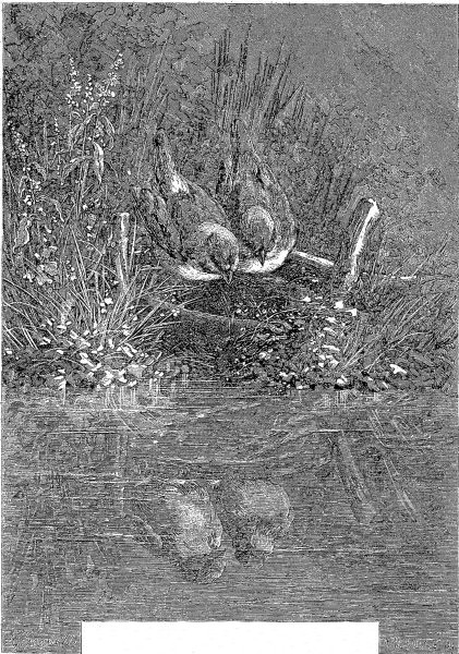 The "trap-door spider" is indeed most interesting. Erber tells us in Life and Her Children, by A. B. Buckley, that he once sat for hours on a moonlight night watching the doings of these insects. He saw two of the spiders come out each from its hole, and pushing open their doors, fasten them back by fine threads to blades of grass. They then spun a web round the open hole, and went back into their tunnels. By-and-by two beetles were caught, one in each web. In an instant the spiders darted out, and pierced their victims with their poisoned fangs, sucked out their soft flesh, and carried the empty bodies away some distance from their holes. Erber left them; but on returning in the morning, he found the spiders had cleared away all trace of the webs, and were shut down snugly in their hidden homes.