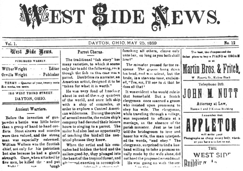 This successful neighborhood weekly was published by Orville Wright on a printing press assembled from old parts found in junkyards and barns. Wilbur Wright was editor. Courtesy, Smithsonian Institution, Washington, D. C.