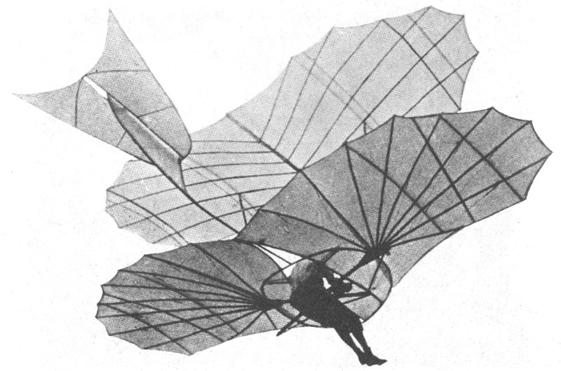 Lilienthal’s two-surface glider of 1895 in which some of his highest and longest glides were made. This German engineer made hundreds of glides with various apparatuses employing birdlike wings.