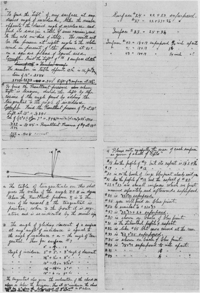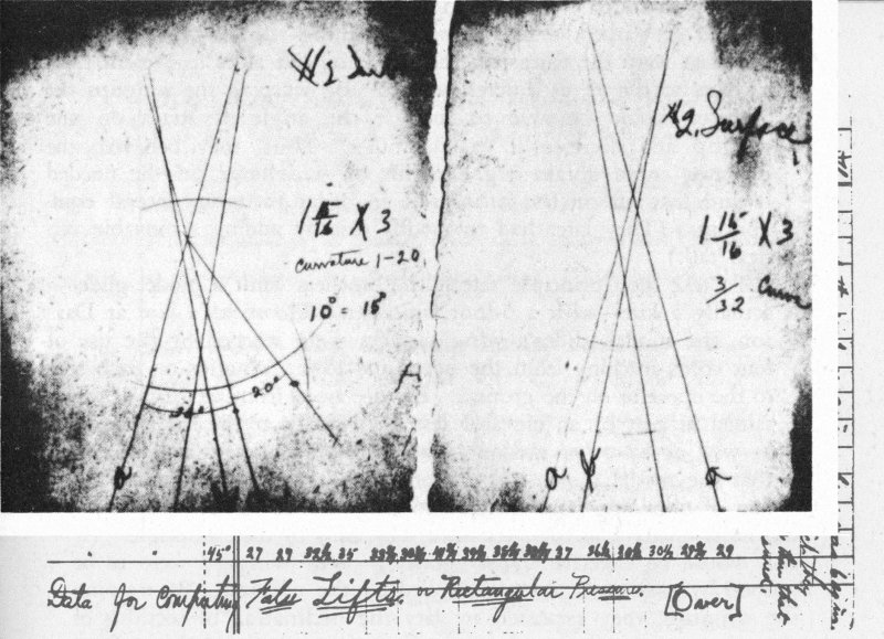 Data and calculations on pressures on an airfoil to achieve equilibrium in an airplane as worked out by the Wright Brothers in experiments in 1899.