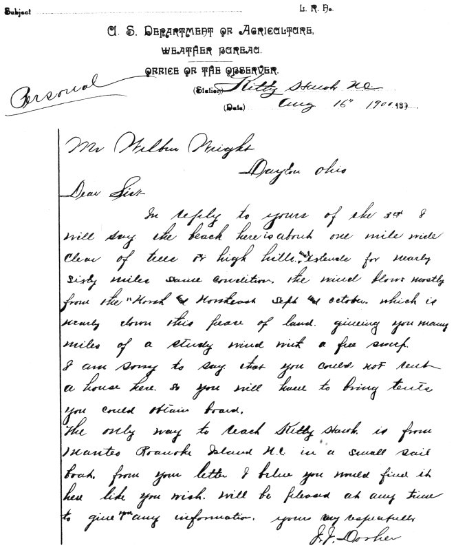 The brothers decided to test their glider at Kitty Hawk after a study of Weather Bureau records and the receipt of this letter.