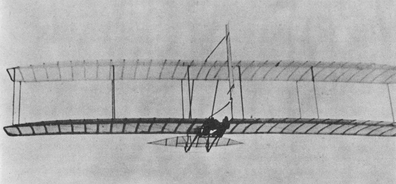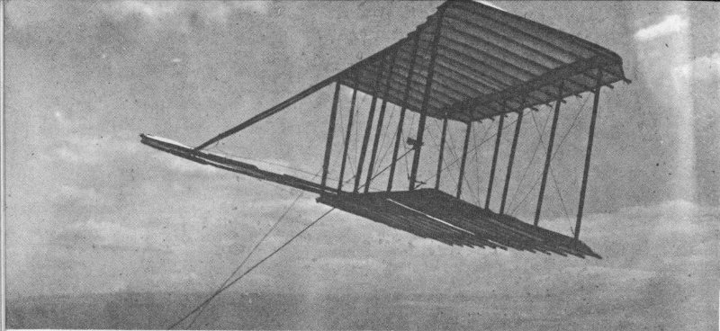 While twisting a small pasteboard box with opposite ends removed, Wilbur observed that though the vertical sides were rigid endwise, the top and bottom sides could be twisted to have different angles at the opposite ends. Here was a simple means of warping the wings as they intended. They decided that a biplane’s wings could be twisted or warped in like manner, enabling them while flying in a glider to warp the wings on the right and left sides to present their surfaces to the air at different angles. By warping the wingtips the operator would be able to increase the angle of attack on one wingtip and decrease it on the other. Thus, they believed, the operator could obtain a greater lift on whichever side he needed it and less lift on the other side in order to assure lateral equilibrium. (They later had to modify this by adding a movable vertical tail.)