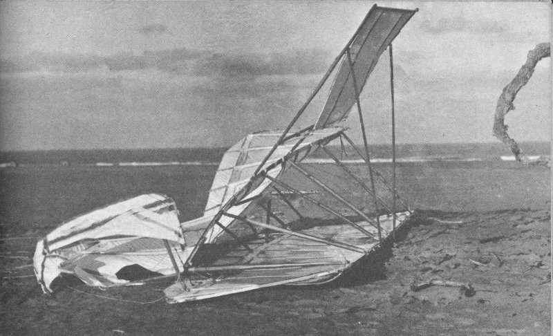 I found myself caught in them wires and the machine blowing across the beach heading for the ocean, landing first on one end and then on the other, rolling over and over, and me getting more tangled up in it all the time. I tell you, I was plumb scared. When the thing did stop for half a second I nearly broke up every wire and upright getting out of it.